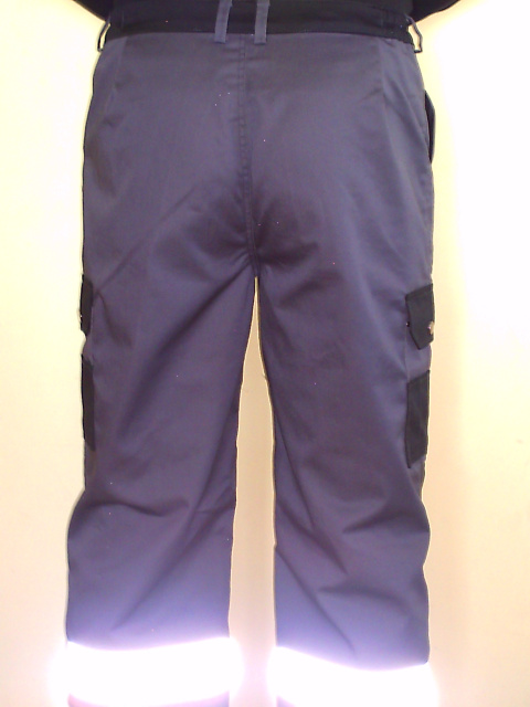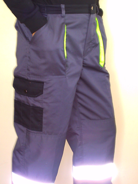 Штани робочі ГРЕЙ - прямого крою з поясом, виконаним з тканини контрастного чорного кольору, що застібається на металеву кнопку, з наколінниками, з двома об'ємними бічними кишенями та двома наколеними кишенями з клапанами з контрастної чорної тканини, що застібаються на текстильну стрічку, з 3 правому колінні кишені під ручку / олівець / викрутку Застібка в середньому шві на блискавку