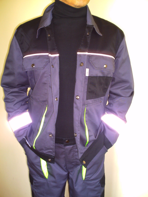 Куртка робоча сіра ГРЕЙ – укорочена під пояс, із застібкою на металеві кнопки, двошовні рукави з манжетами, що застібаються на металеві кнопки. Передбачені дві нагрудні кишені із застібкою на текстильній стрічці та дві нижні кишені з боковим входом. На рукавах передбачена світлоповертальна стрічка 5 см. Відкладний комір. Пояс куртки, манжети рукавів і верх передньої та задньої частин куртки виконані з оздоблювальної тканини контрастного чорного кольору. Під оздоблювальною кокеткою по спинці та поличках прокладено кант контрастного жовтого кольору.